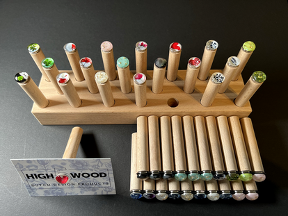 Hij bestaat uit twee gedeeltes: de houten pin van FSC © beukenhout, en de glazen bovenkant met afbeelding, ook wel de "Orb" genoemd. Aan beide zit een sterke platte neodymium magneet.