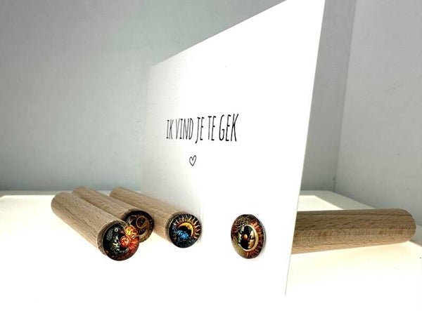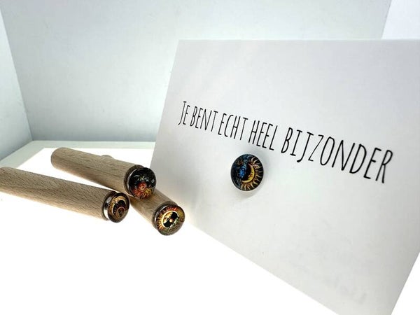 De Sun & Moon kaartpinnen set bestaat uit vier prachtige afbeeldingen van de zon samen met de maan. Deze kleurrijke pins zijn byzonder mooi vormgegeven, volle kleuren en passen uitstekend bij bijvoorbeeld een tarot kaart of spirituele kaarten . Maar kan natuurlijk bij elk kaartje, zoals een visitekaartje, ansichtkaart, menukaart of foto. Deze kaarthouder set van 4 komt net als alle andere sets in een prachtig zwart crafts doosje. Daarmee is dit het ideale cadeautje om te krijgen, maar zeker ook om te geven!