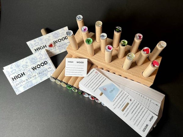 Het display is net als de kaartpinnen gemaakt van FSC© gecertificeerd loofhout uit Europa. Het blok is rondom aan alle zijden glad geschuurd. De maten van het display zijn 18 x 6 x 3 cm (LxBxH). Het display is zo samengesteld dat de kaartpinnen ver genoeg uit elkaar staan om geen magnetisme van elkaar te ondervinden. Hierdoor blijven de magneetjes mooi in het midden van zowel de Orb als het houten gedeelte van de kaartpin. Zoals gezegd is dit start pakket ideaal om in fysieke winkels te proberen. De kaartpin is leuk om bij een kaart cadeau te geven zodat de ontvanger de kaart direct leuk kan neerzetten. En heb je een kaartpin uit het display verkocht, je vult hem eenvoudig aan met de voorraad meegeleverd met het display.